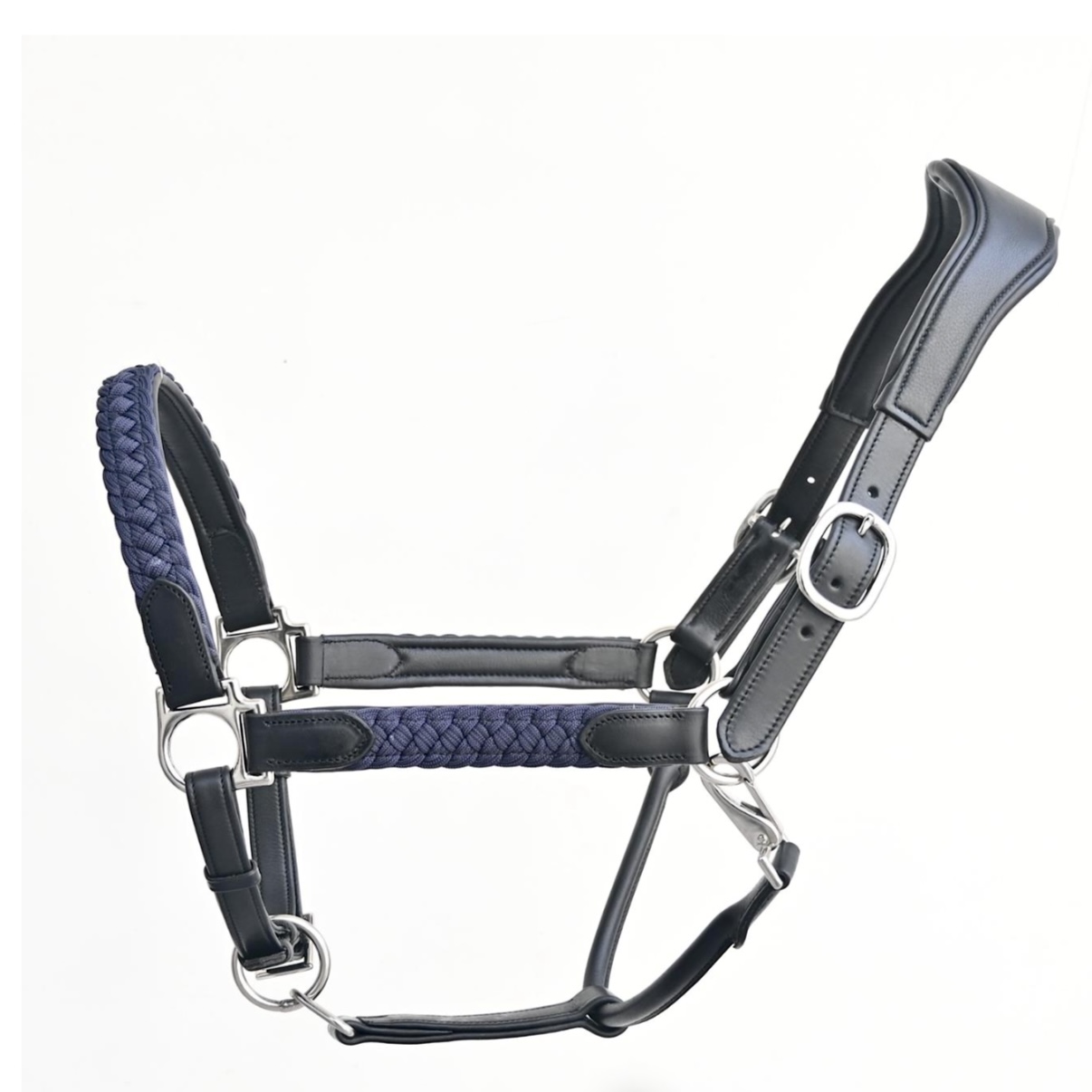 Denne lædergrime fra Chrystelli kombinerer stil, funktionalitet og luksus. Fremstillet af blødt læder og designet med blåt nylonflet på siderne og næsen, får du et elegant og eksklusivt look. Grimen er udstyret med et anatomi-formet nakkestykke, der sikrer optimal komfort, og kan justeres på begge sider og under hagen, så den sidder perfekt.