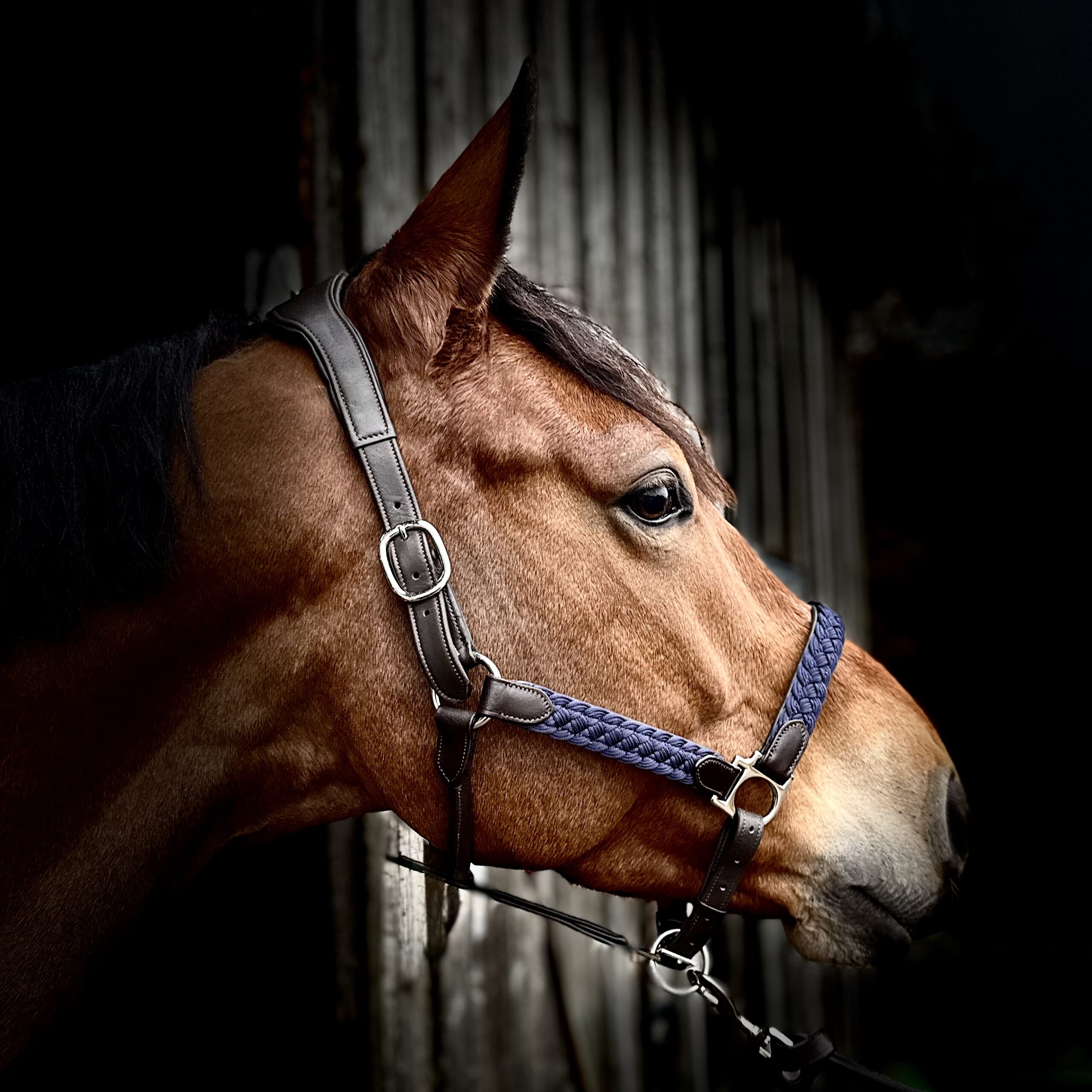 Lædergrime med dejligt blødt læder og blå detaljer.