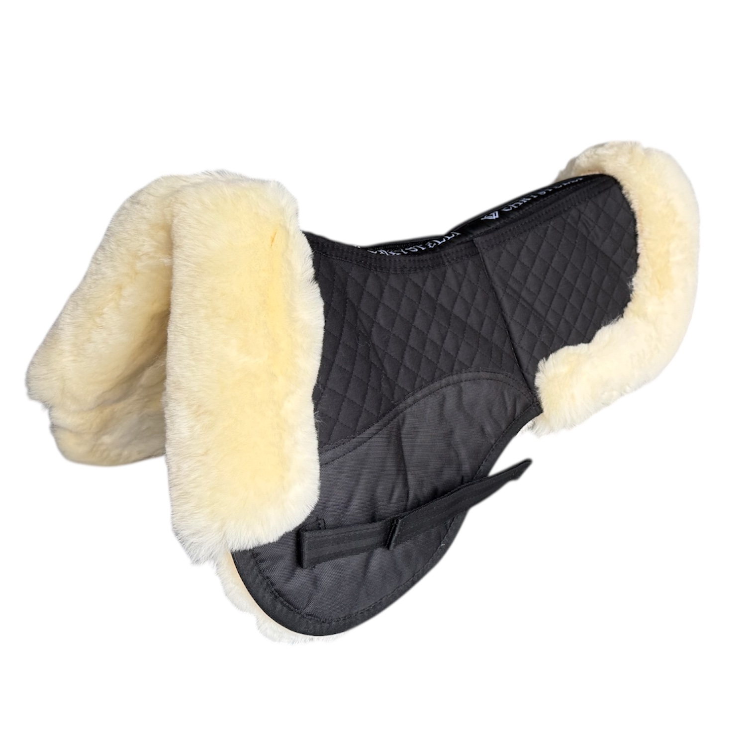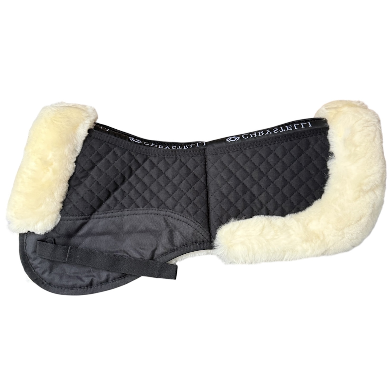 Oplev Chrystellis eksklusive lammepad i ægte lammeskind med korrektion. Den anatomiske form sikrer optimal pasform, med en mankeformet udskæring og let reduceret tykkelse ved hestens rygrad. Den smukke lammeskindskant både foran og bagpå sadlen tilføjer elegance. Velcrostropper på begge sider holder padden sikkert på plads, mens de små tern bevarer dens oprindelige form. Underlaget har lommer for og bag og tilhørende indlæg så at sadlen kan løftes hvor det er nødvendigt – hvis sadlen ikke ligger helt perfekt på hesten.