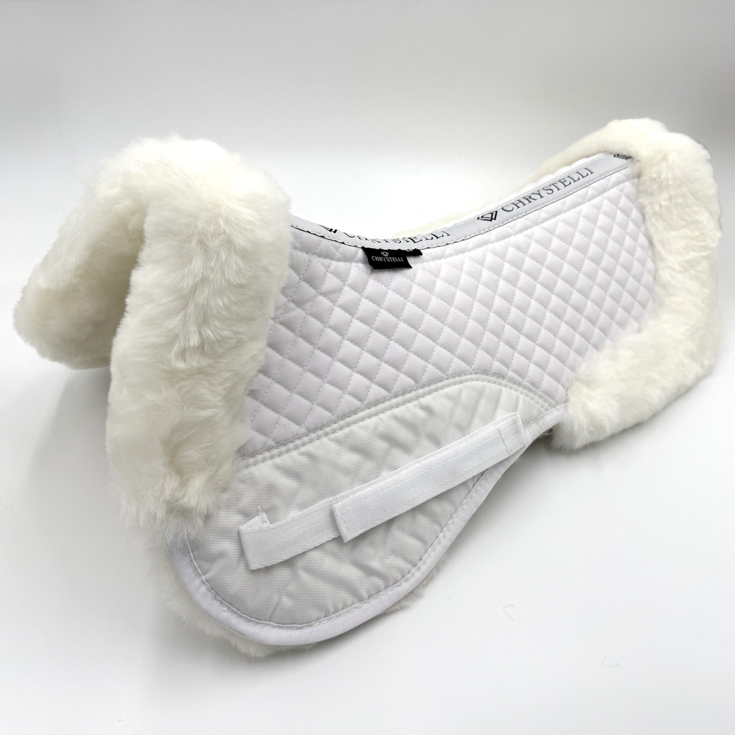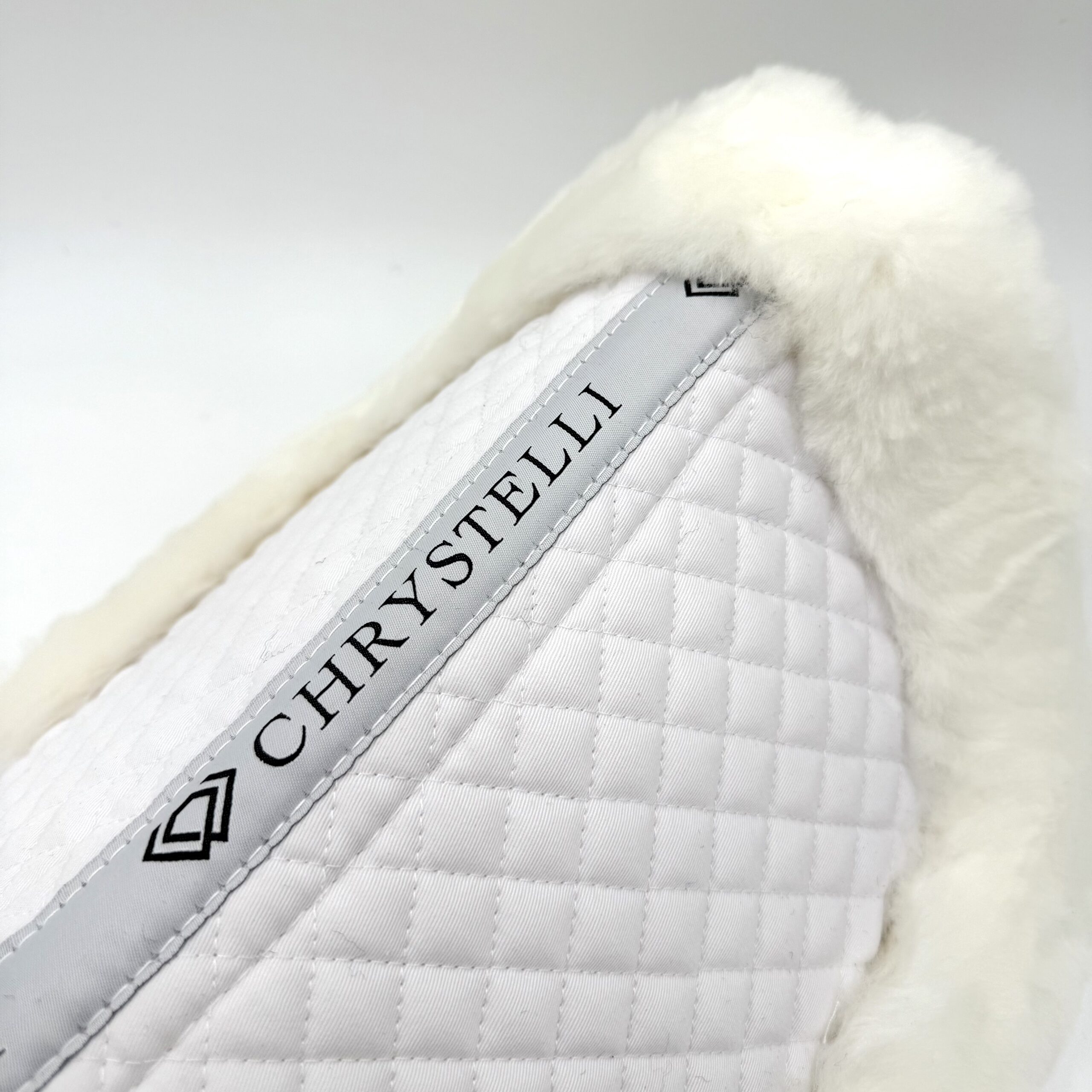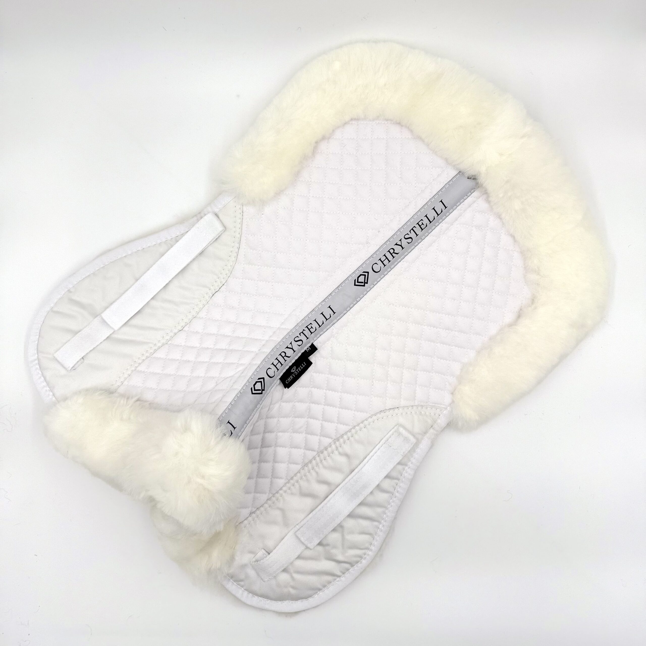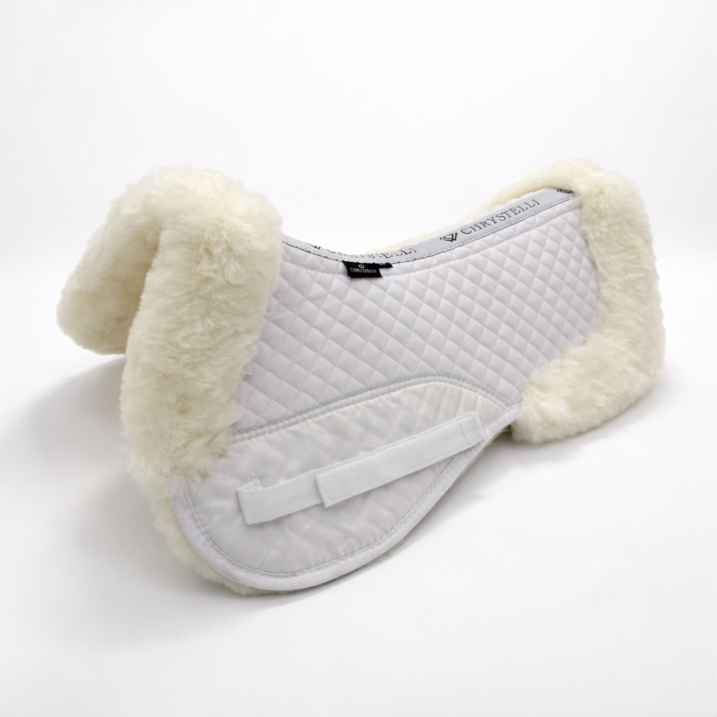 Oplev Chrystellis eksklusive hvide lammepad i ægte lammeskind, der kombinerer komfort og design. Den anatomiske form sikrer optimal pasform, med en mankeformet udskæring og frilagt ryg for at beskytte hestens rygrad. Den smukke lammeskindskant både foran og bagpå sadlen tilføjer elegance. Velcrostropper på begge sider holder padden sikkert på plads, mens de små tern bevarer dens oprindelige form.
