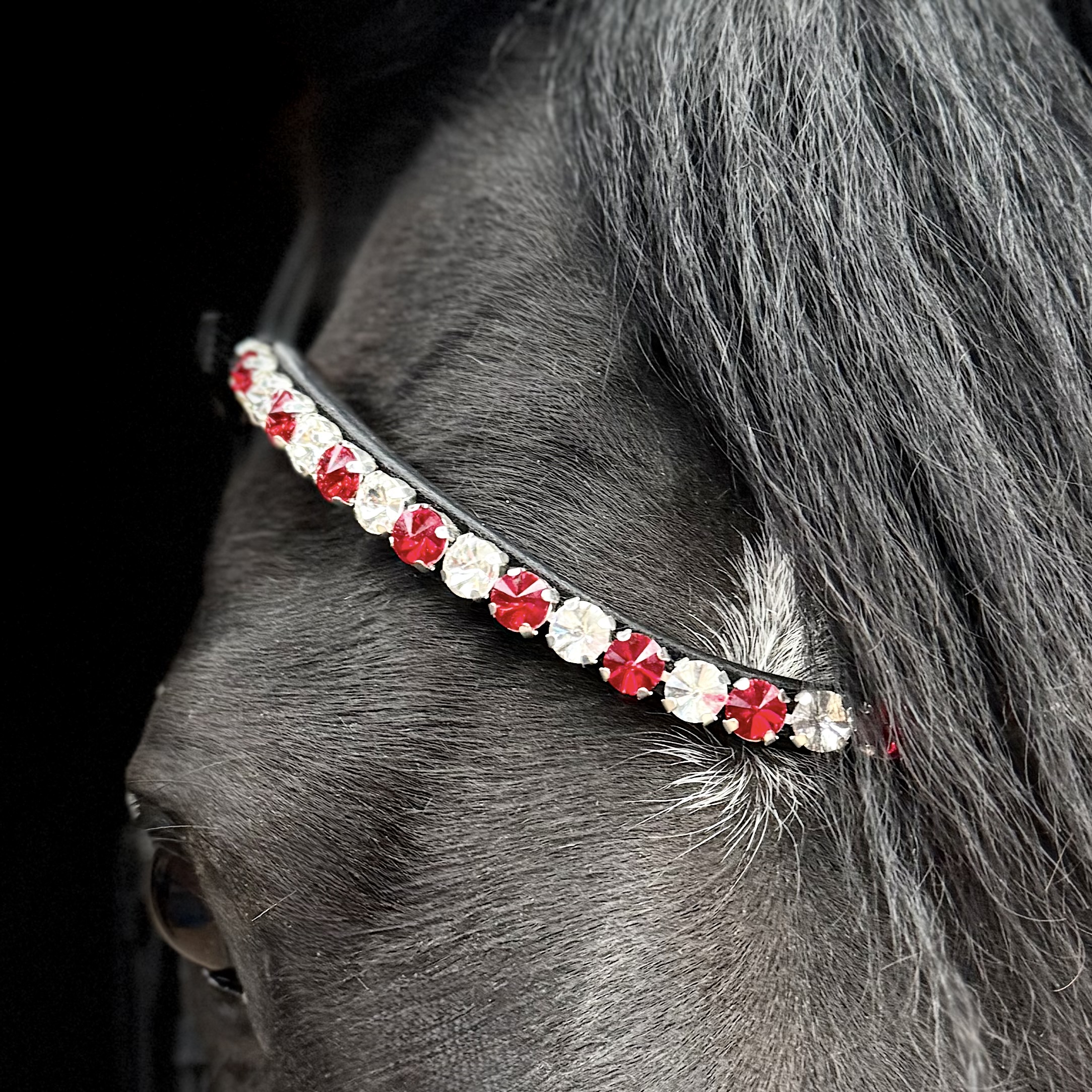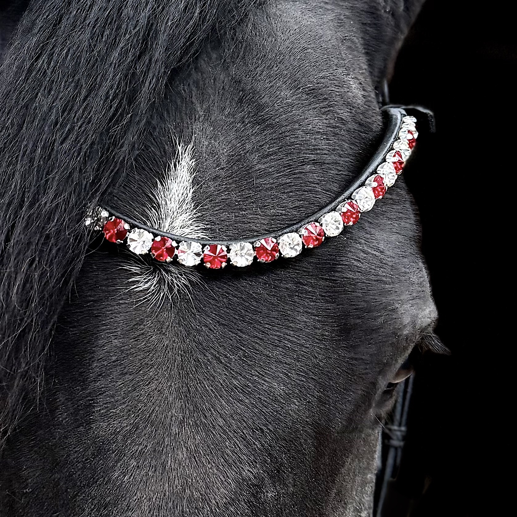 Giv din hest et eksklusivt og tidløst udtryk med dette smukke pandebånd. De funklende og skinnende 10 mm sten i danmarks farver.