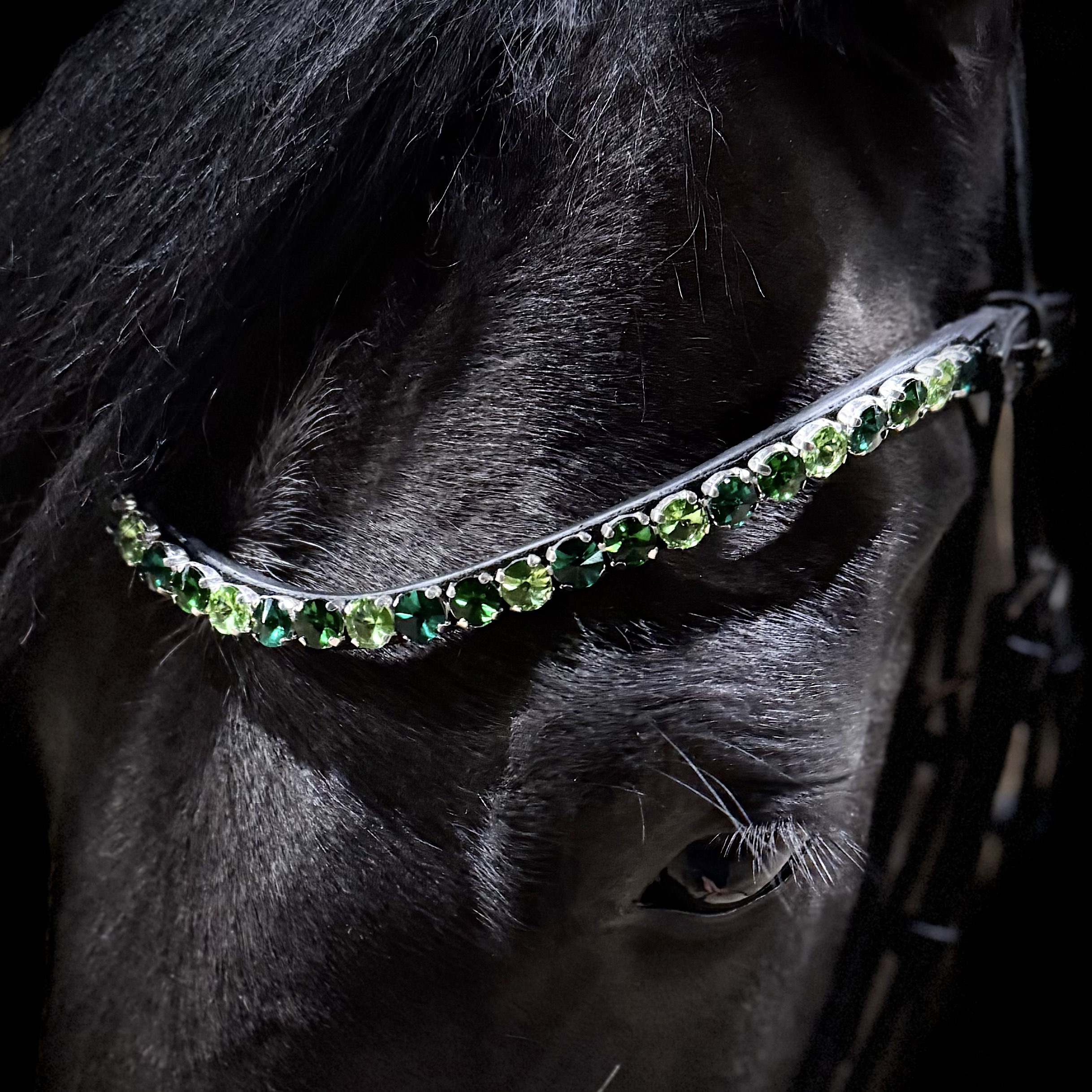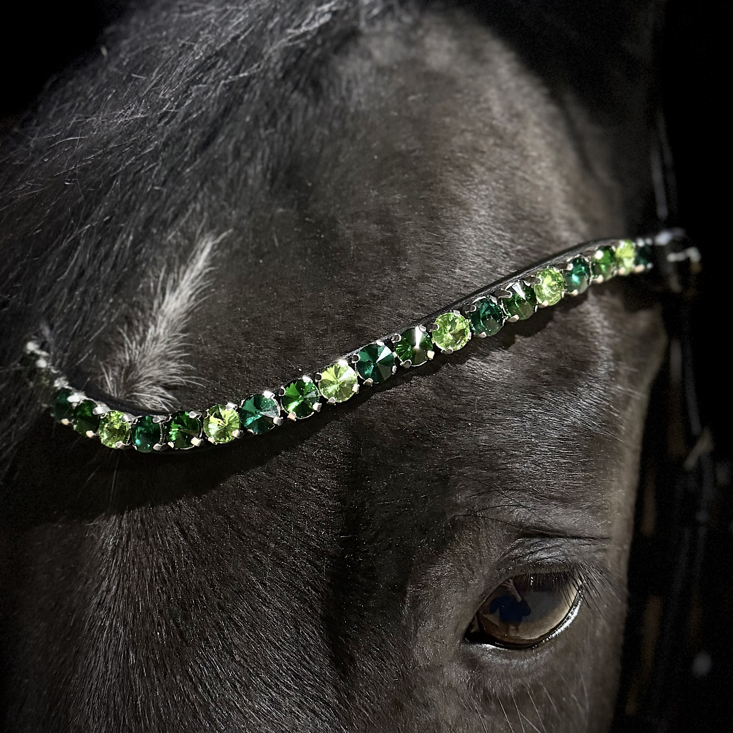 Giv din hest et eksklusivt og tidløst udtryk med dette smukke pandebånd. De funklende og skinnende 10 mm sten er nøje udvalgt i en varm grøn symfoni, der fremhæver hestens udtryk uden af tage opmærksomheden fra helheden.