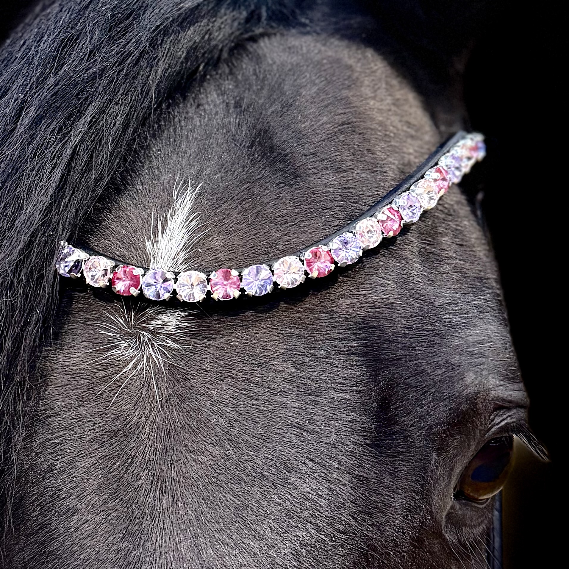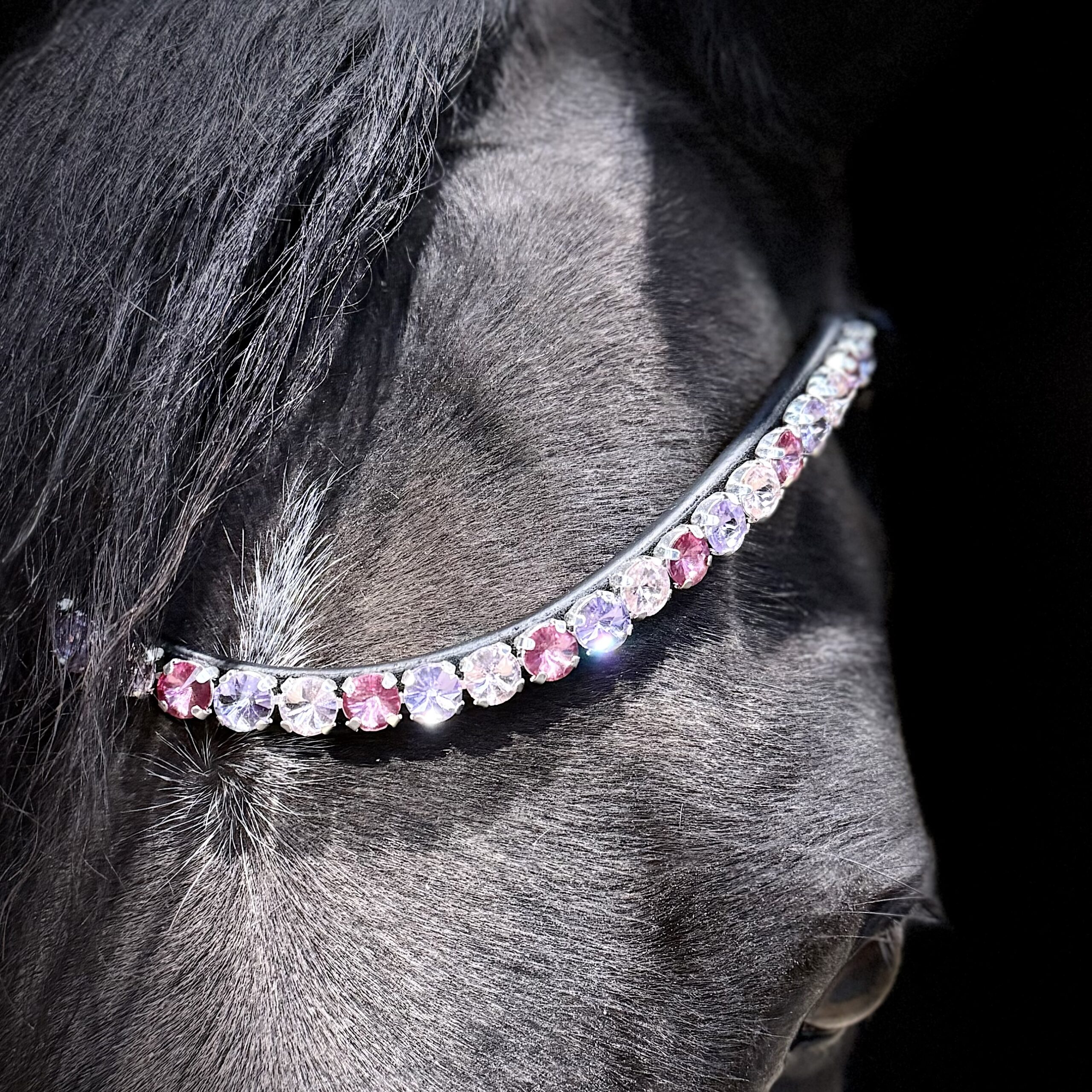 Giv din hest et eksklusivt og tidløst udtryk med dette smukke pandebånd. De funklende og skinnende 10 mm sten er nøje udvalgt i en lyserød og lilla symfoni, der fremhæver hestens udtryk uden af tage opmærksomheden fra helheden.