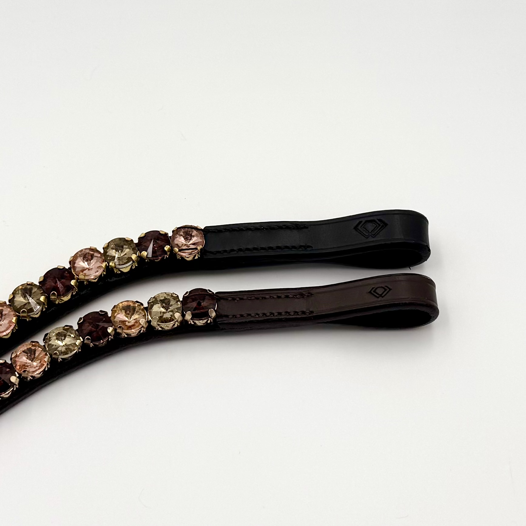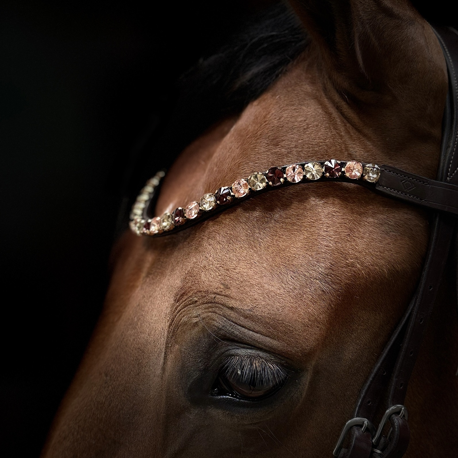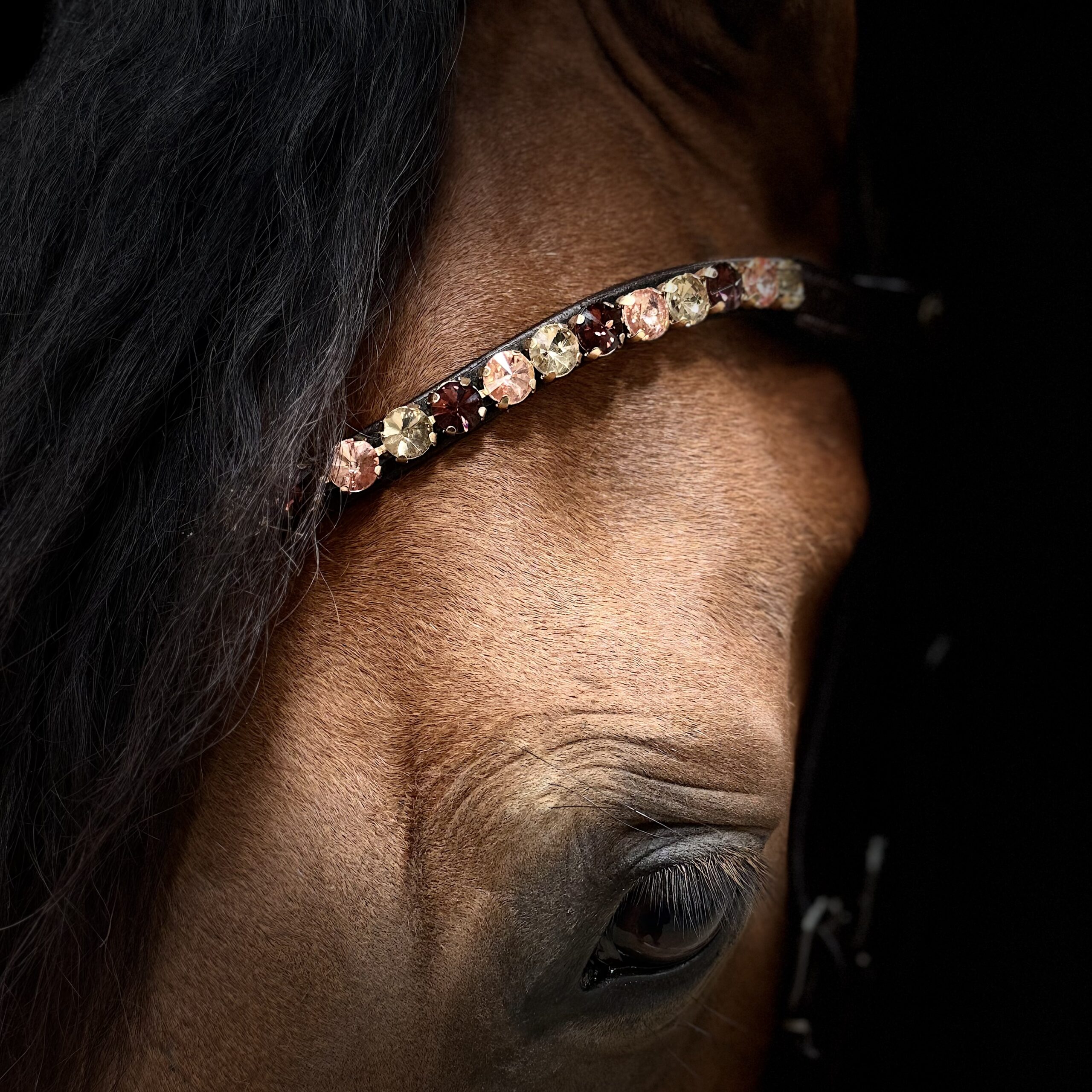 Giv din hest et eksklusivt og tidløst udtryk med dette smukke pandebånd. De funklende og skinnende 10 mm sten er nøje udvalgt i en varm brunlig symfoni, der fremhæver hestens udtryk uden af tage opmærksomheden fra helheden.